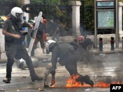 Грек өкмөтүнүн анти-кризисттик планына каршы Афиныда миңдеген адамдар катышкан толкундоолор өттү. Тополоңдон бир көрүнүш. 5-май. 2010