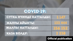 Вирус соңку бир суткада дагы 1147 кишиден аныкталды. Алардын эң көбү Бишкек шаарында - 661 бейтап. Расмий маалыматка ылайык, ушуну менен вирус жуккандардын жалпы саны 156 152 адамга жетти. Андан 133 444 бейтап айыкты. Өлкөдө коронавирустун үчүнчү толкуну жүрүп жатат.