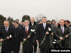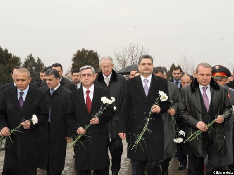Армениянын жетекчилери Азербайжан менен болгон согушта өлгөн армяндардын мүрзөлөрүнө гүл койгону баратышат. Еревандагы аскерий гөрүстөн. 30-декабрь 2009