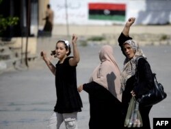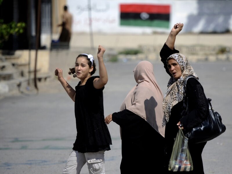 Ливиялык аялдар Триполинин көчөсүндө Каддафи жеңилгенин айтып кыйыкырып баратышат. 23-август